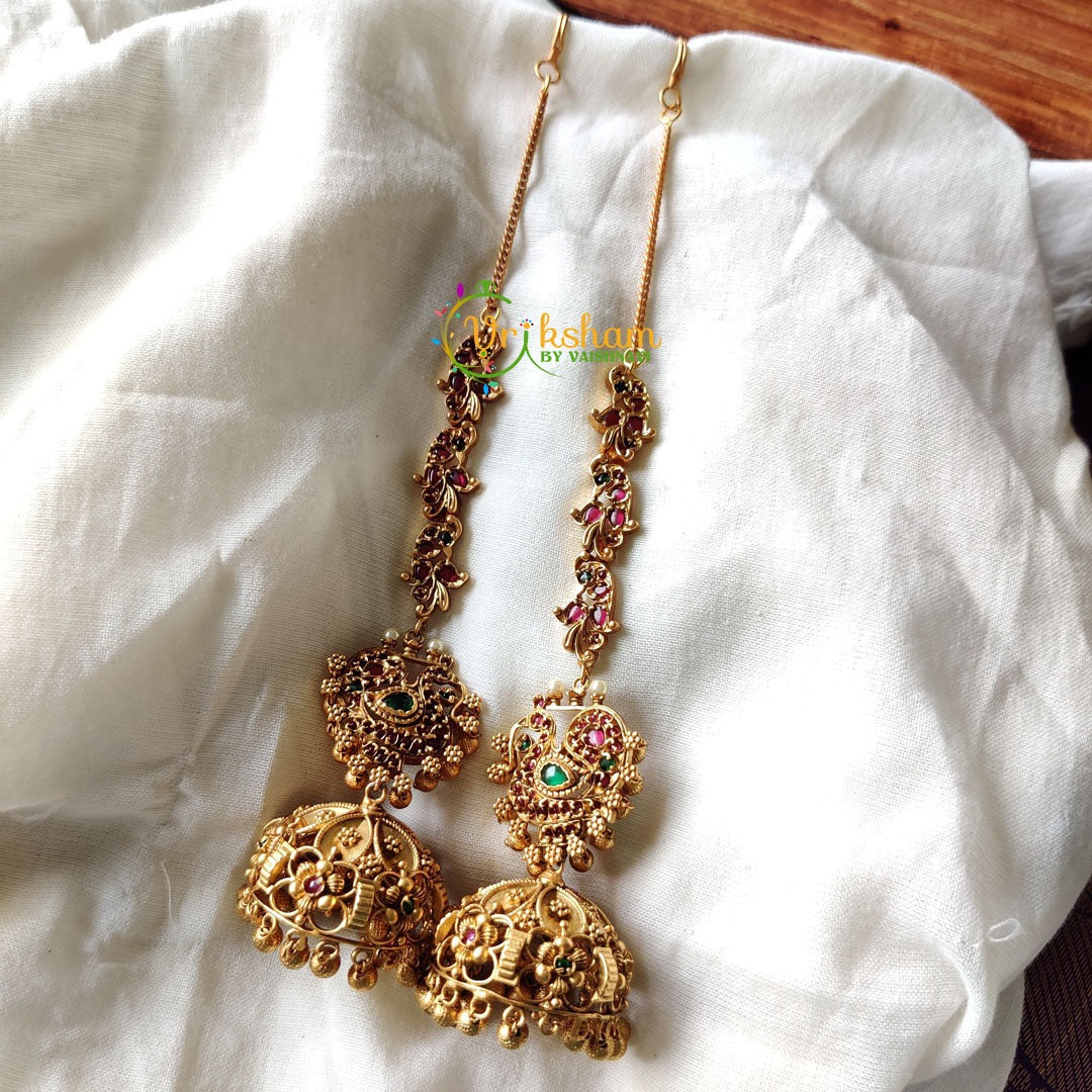 Kemp Peacock Jhumkas with Peacock Earchains -Flower patterned jhumkas with peacock ear studs and peacock earchain maatil; semi precious kemp studded jhumkas of premium quality.