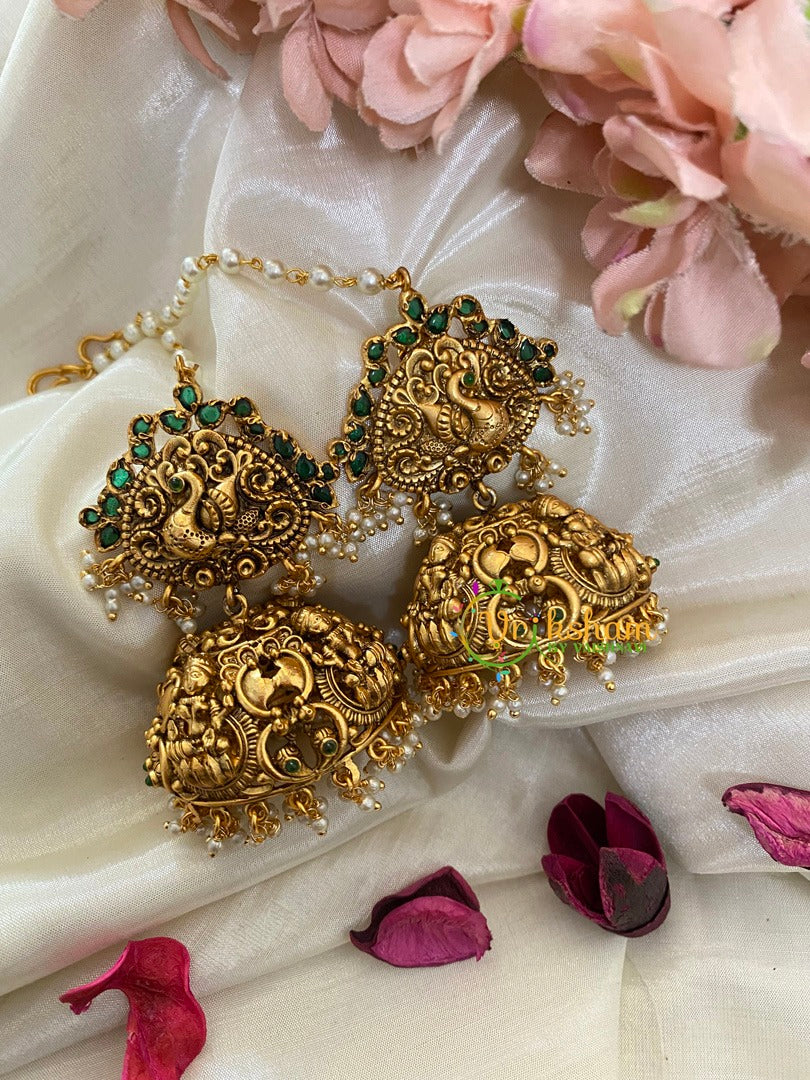 Traditional Peacock Jhumkas with Maatil- Red Green ad stone studded in feather pattern with single strand pearl maatil.