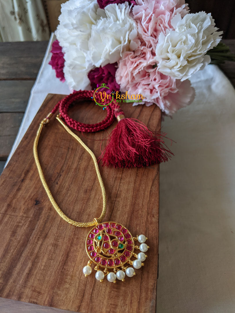 Peacock Kemp Addigai -Red Green Kemp addigai studded Peacock pendant with pearl finish.