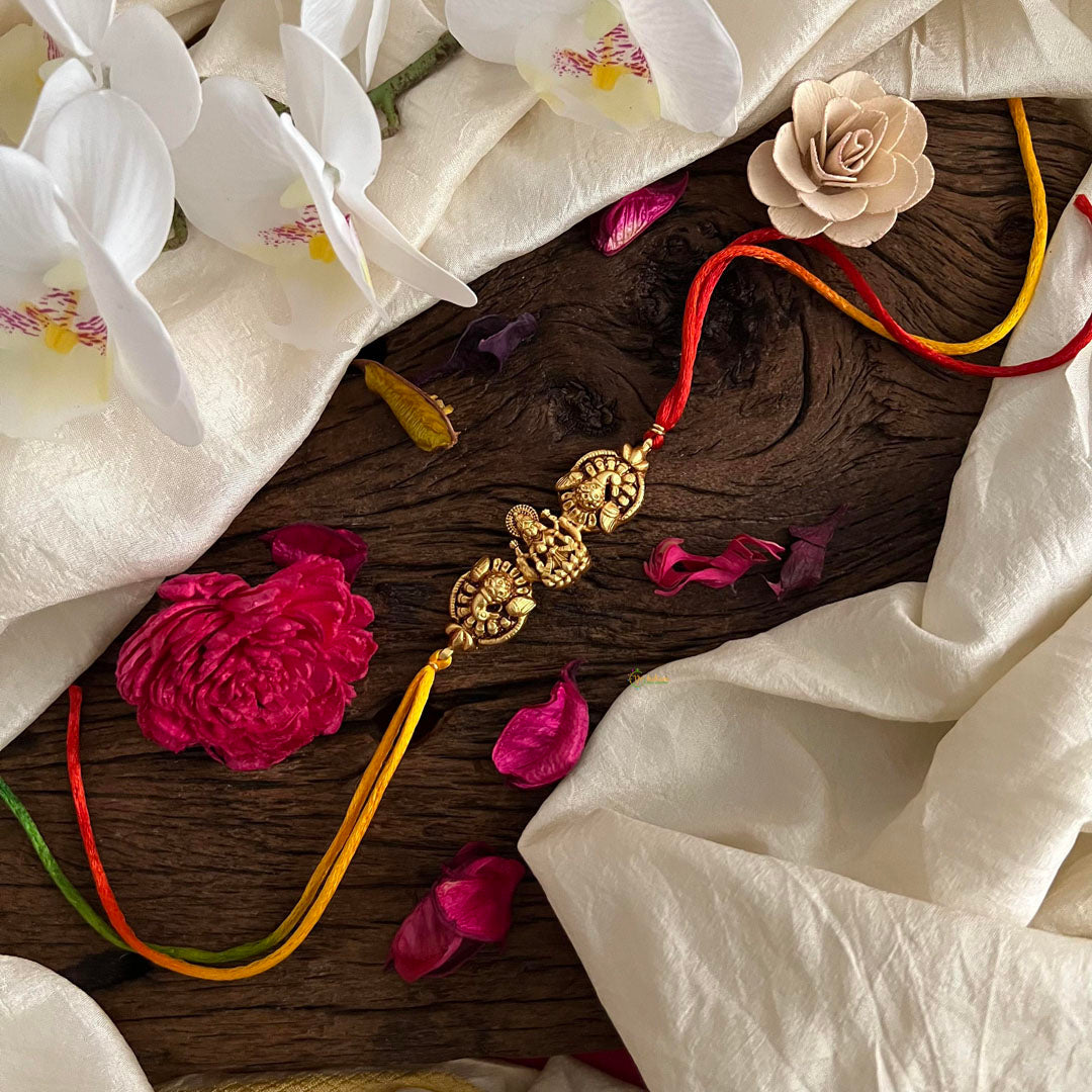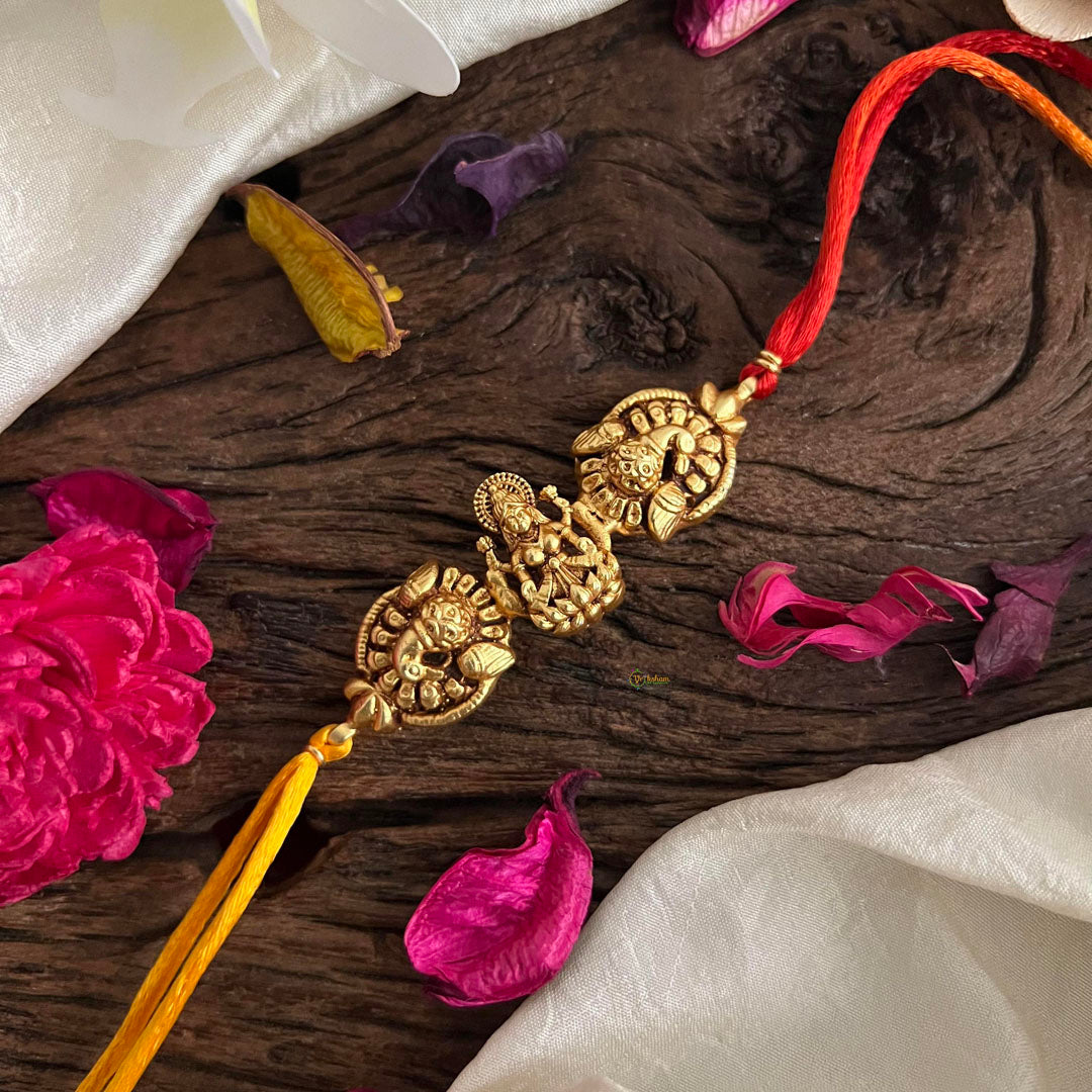 This Peacock Lakshmi Pendant Rakshabandha Rakhi is a symbol of protection and love, adorned with a beautiful peacock design and Lakshmi pendant. The vibrant yellow, red and green thread add a touch of joy to this traditional rakhi, making it a meaningful and thoughtful gift for your loved ones during this special festival.