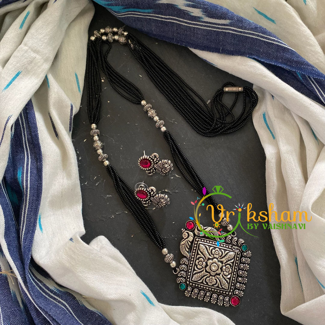 Peacock Pendant Black Beaded Chain– Oxidized Kolhapuri pendant neckpiece; black bead chain with german silver beads