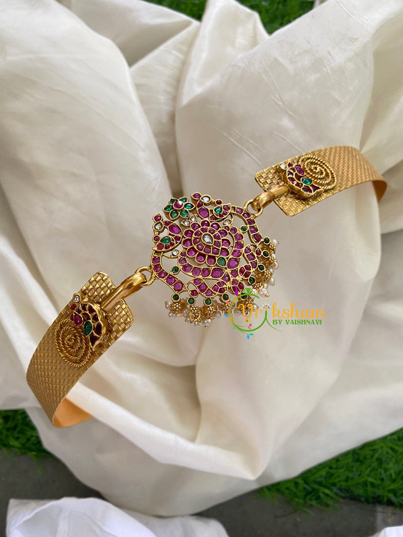 Premium AD Stone Dual Peacock Pendant Plain Hipbelt-Paisley -Elegant centre pendant with ad stone Peacock design and Paisley peacock(stones) on either sides of ferns embossed plain Hipbelt.