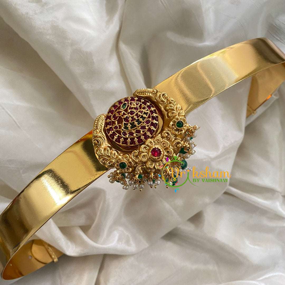 AD Stone Peacock Pendant Plain Hipbelt–Bold - Gold Look alike Hipbelt with green and red imitation stone plain hipbelt. Green bead and Pearl finish.