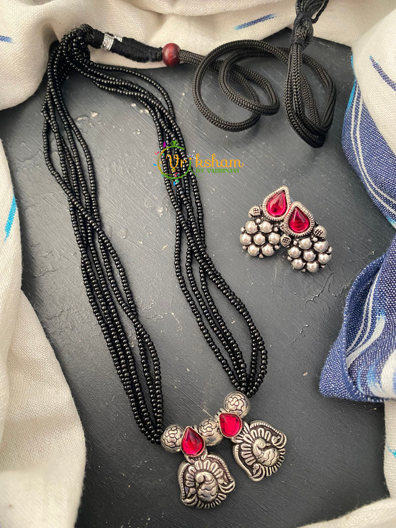 Peacock Pendants Black Bead Short Chain– Oxidized Kolhapuri pendant neckpiece; black bead chain with black rope.