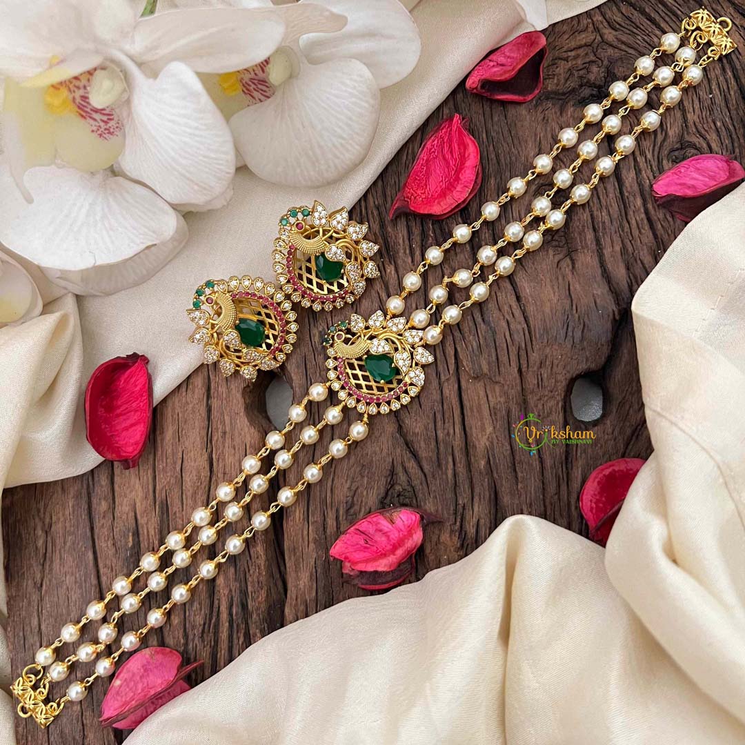 Gold look alike Pearl High Neck Choker-Peacock Red Green ad stone studded centre pendant- 3 layered pearl choker; comes with matching Earrings