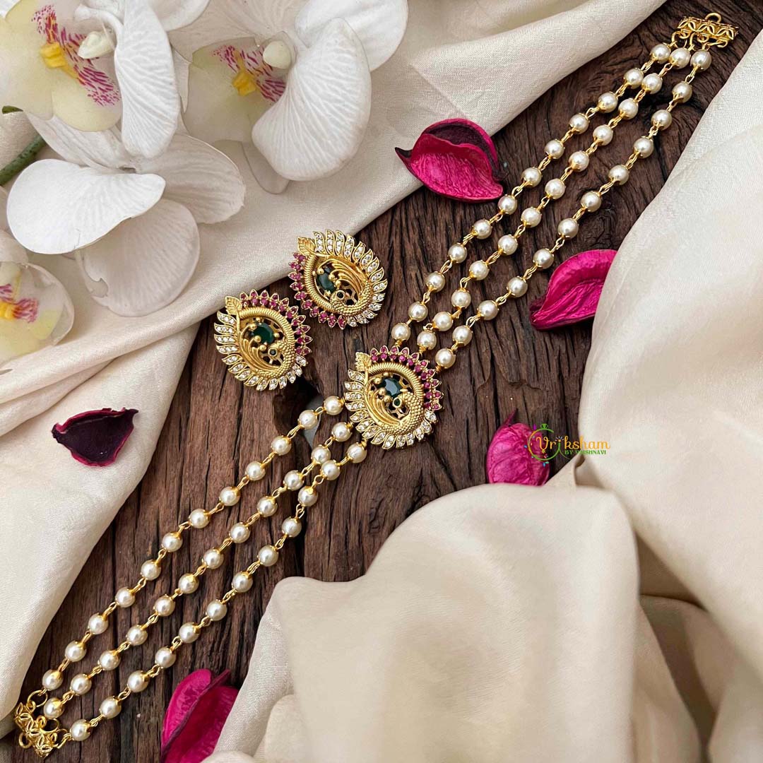 Gold look alike Pearl High Neck Choker-Peacock -Red Green White ad stone studded centre pendant- 3 layered pearl choker; comes with matching Earrings MAKE MATERIAL – Gold look alike Pearl...