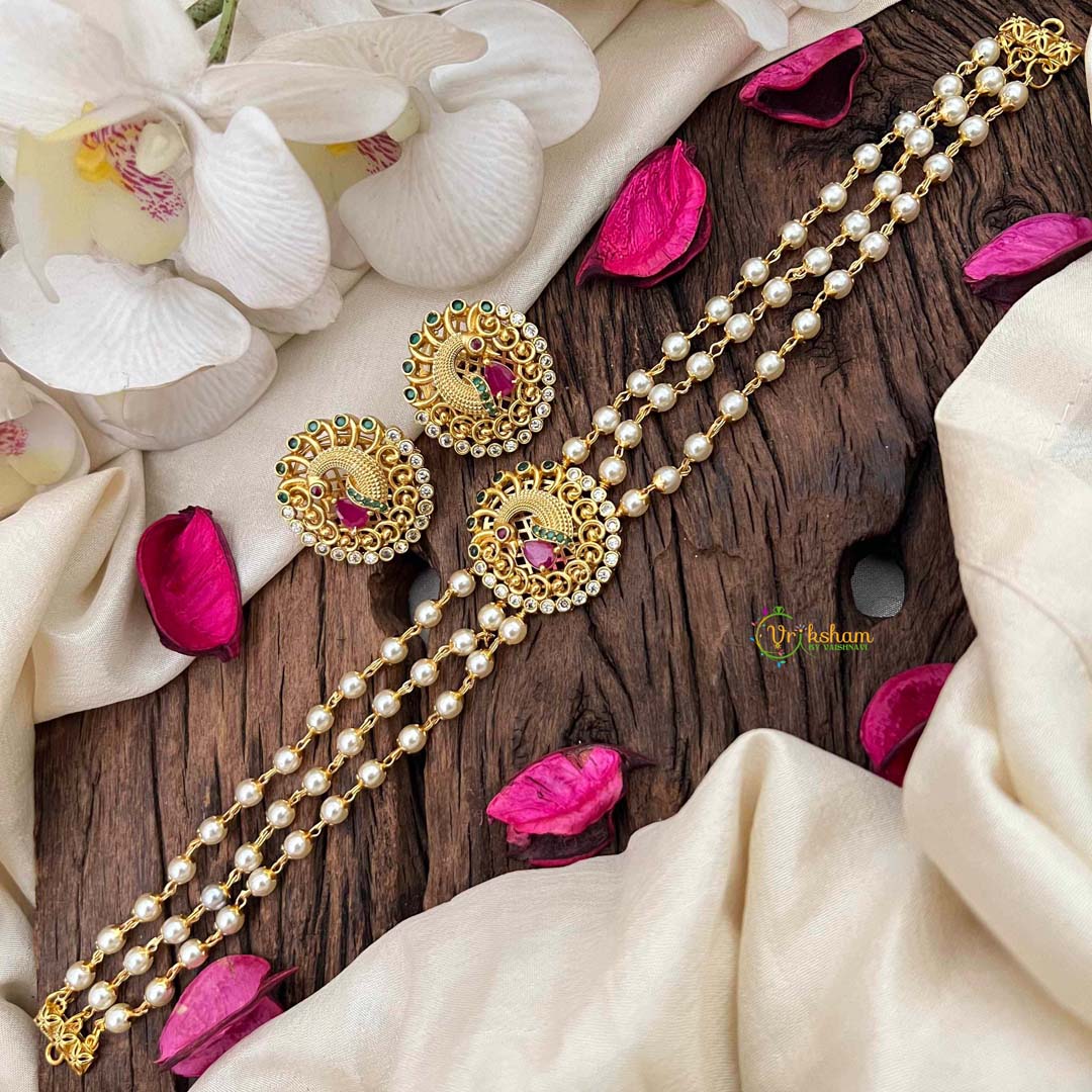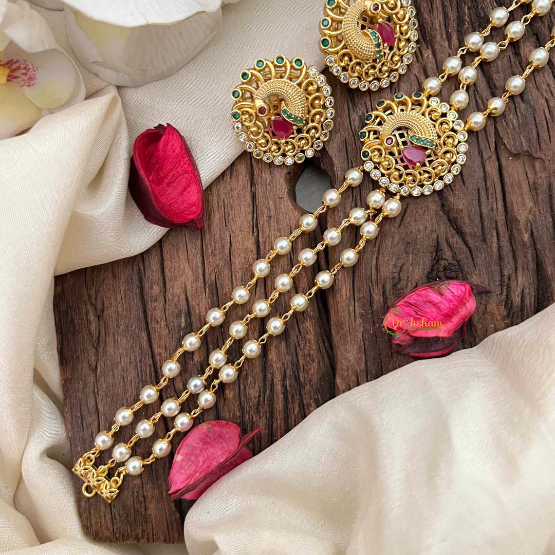 Gold look alike Pearl High Neck Choker-Peacock -Red Green White ad stone studded centre pendant- 3 layered pearl choker; comes with matching Earrings