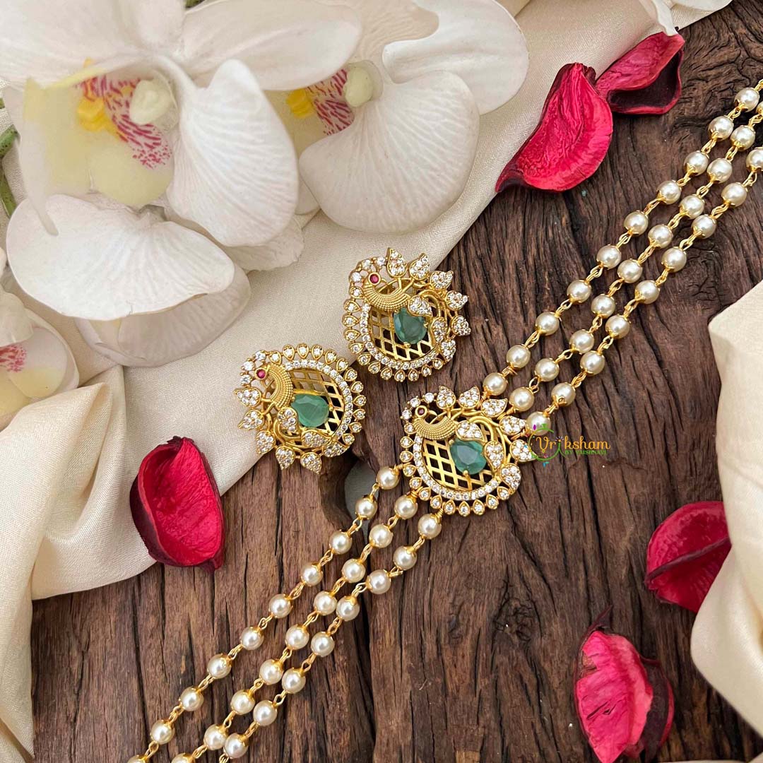 Gold look alike Pearl High Neck Choker-Peacock -Pastel Green ad stone studded centre pendant- 3 layered pearl choker; comes with matching Earrings