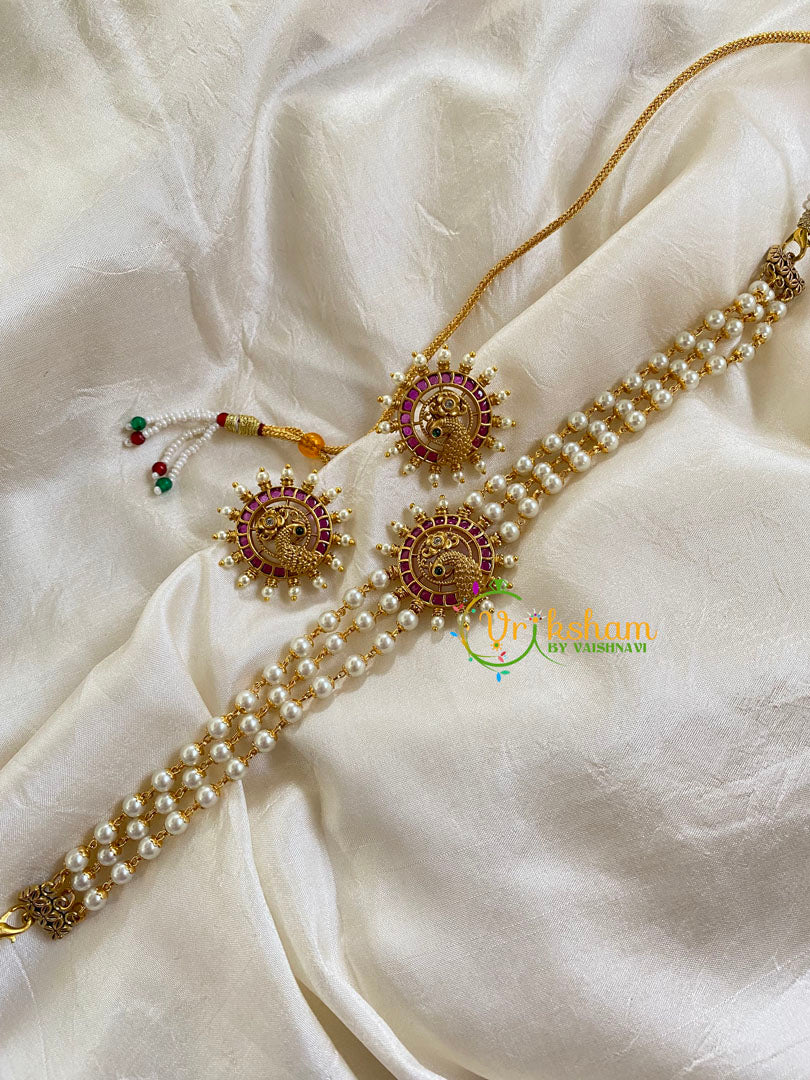 Gold look alike Pearl High Neck Choker-Round Peacock -Red green ad stone studded centre pendant- 3 layered pearl choker; comes with matching Earrings