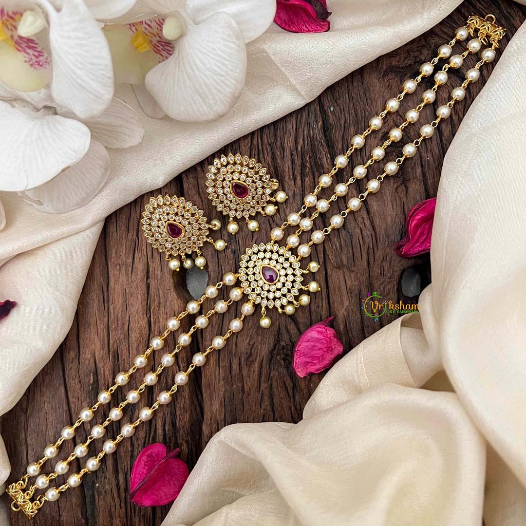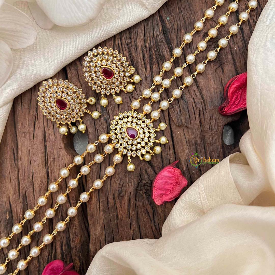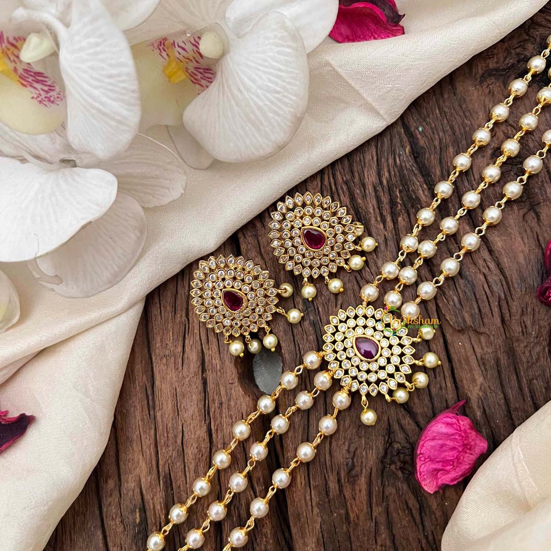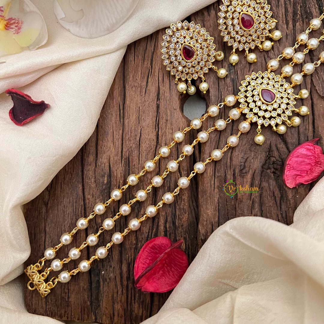 Gold look alike Pearl High Neck Choker- -Tilak Red - AD stone studded center pendant and 3 layer pearl choker with Earrings