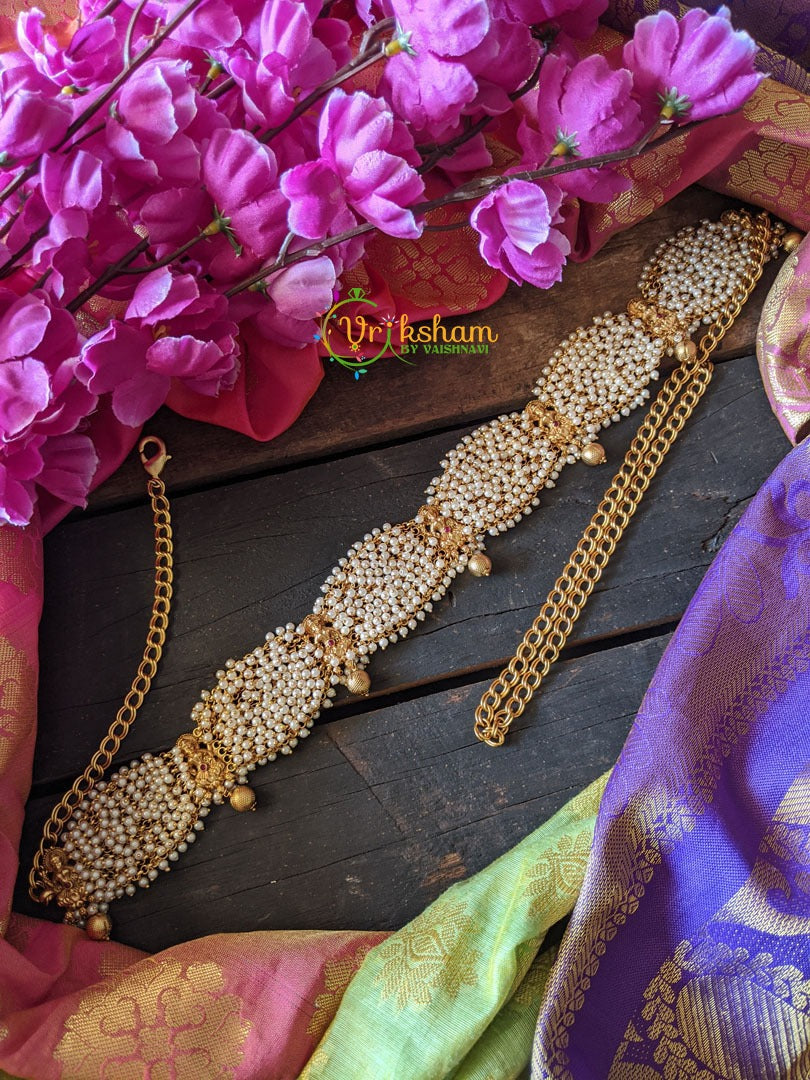 Pearl Lakshmi Hipbelt - This is a Premium Quality gold look alike Hipbelt. This has an array of very intricate pearl embellishments. Lakshmi is used inbetween the strands to make it look beautiful.