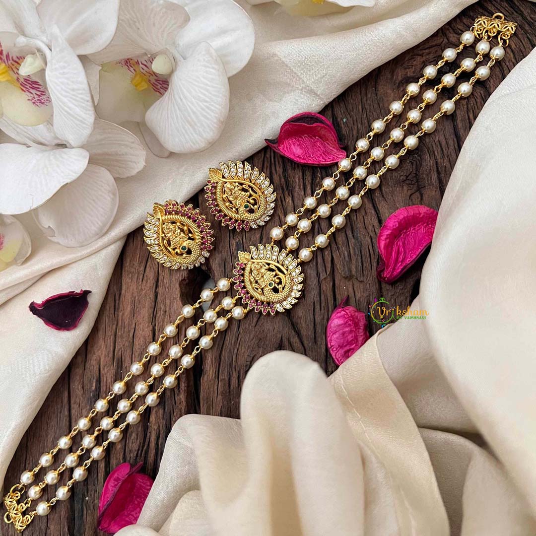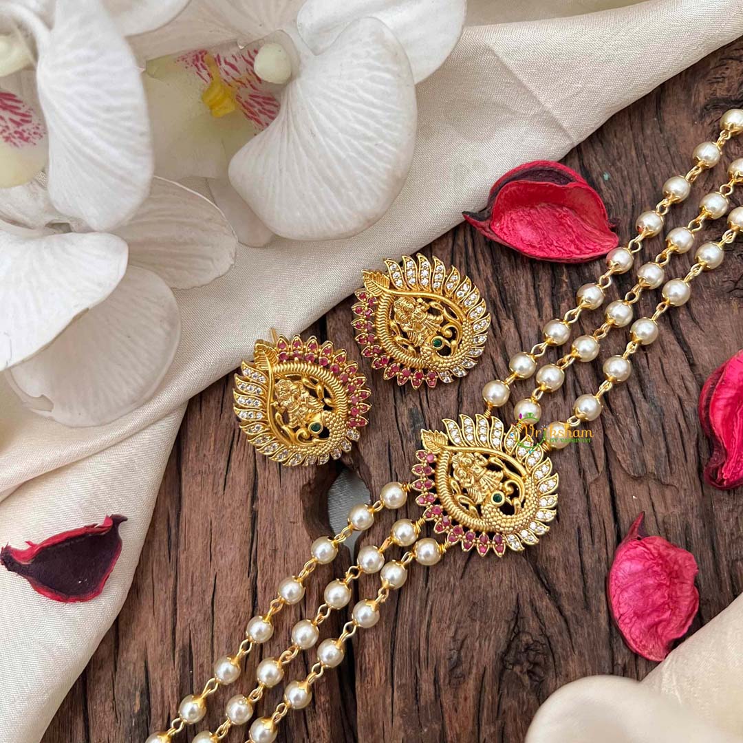 Pearl Temple High Neck Choker-Peacock -Red White ad stone studded centre pendant- 3 layered pearl choker; comes with matching Earrings