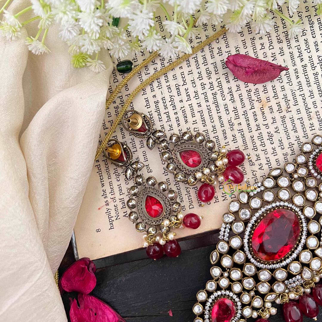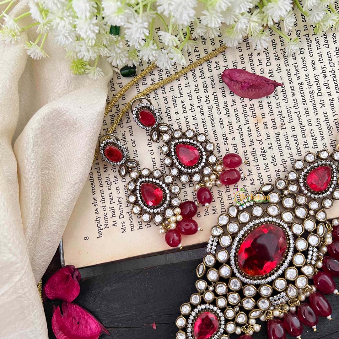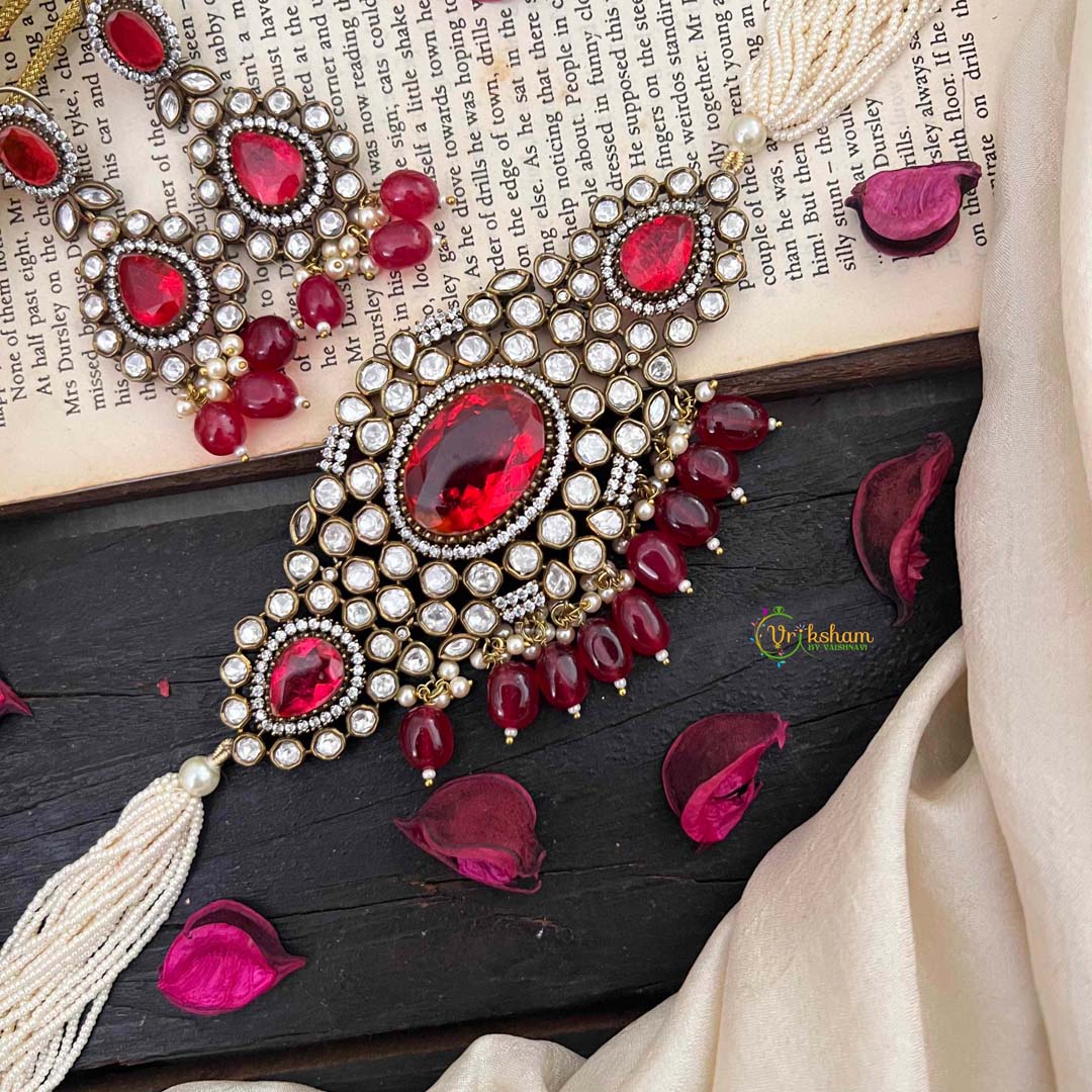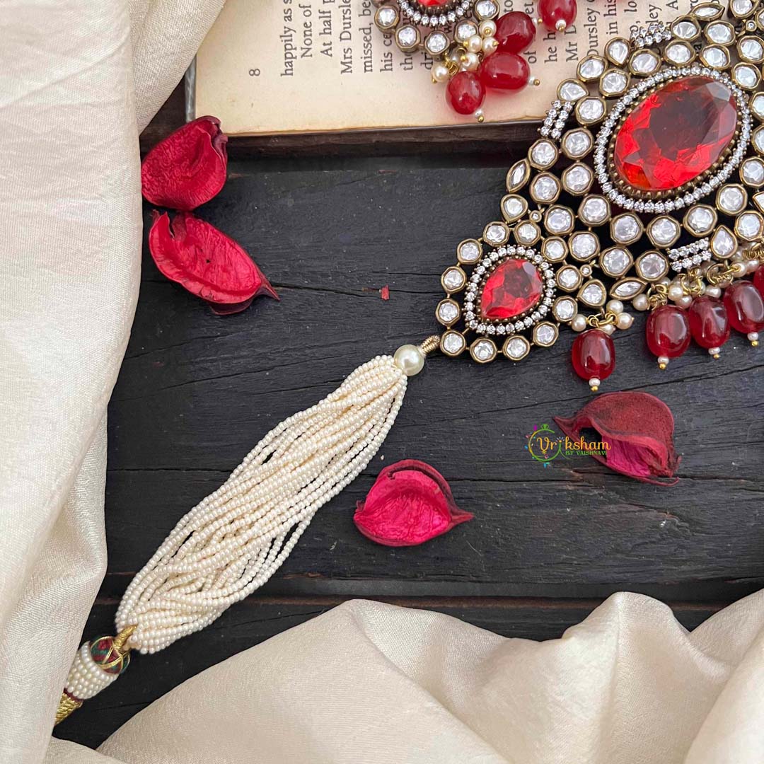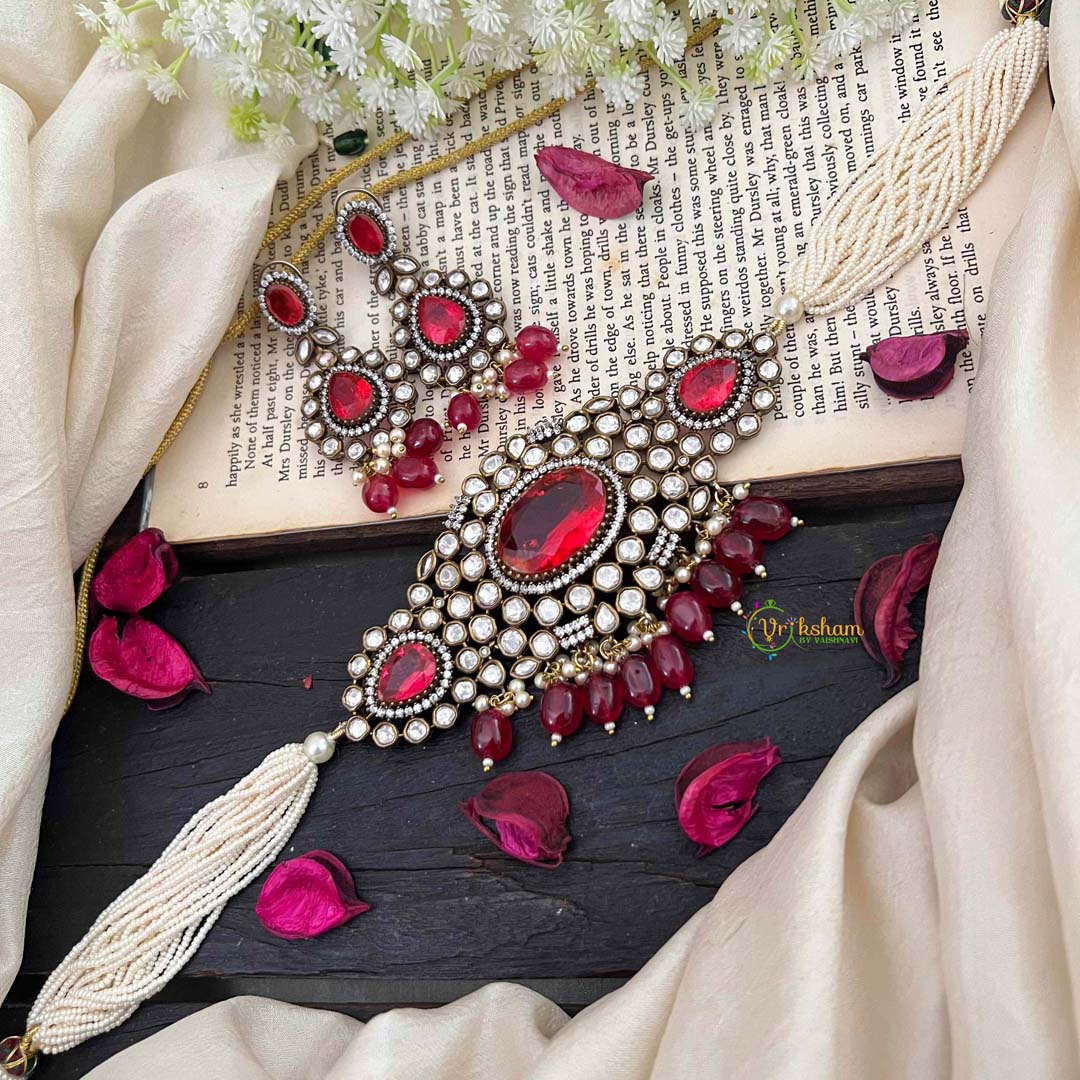 Pearl Victorian Diamond High Neck Choker - RED precious stone and white AD stone studded perl finish royal jewelry; comes with matching earrings.