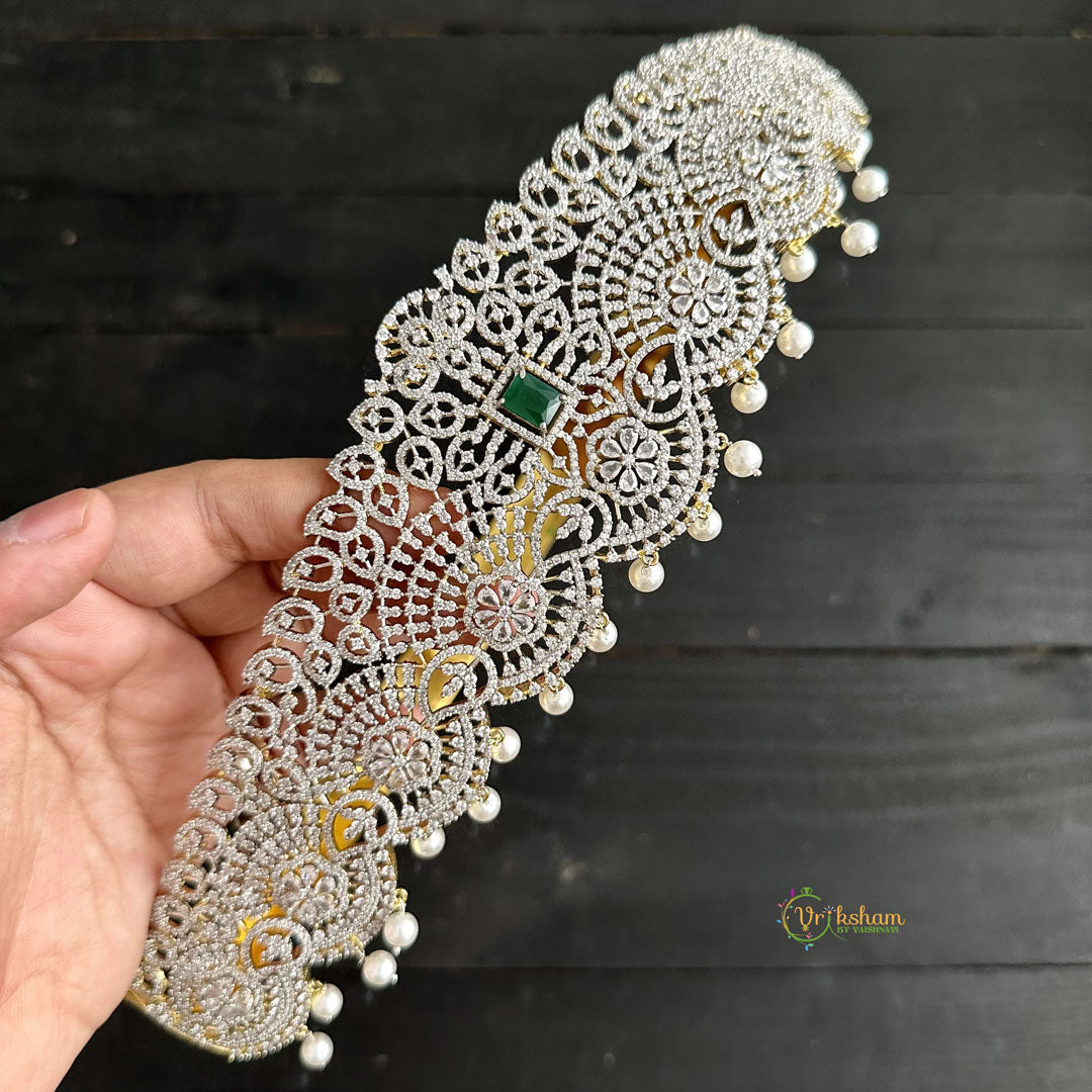 Premium American Diamond Bridal Hipbelt -Green-Single Centre Stone complete white American diamond hipbelt with Pearl finish. Made for wedding and festive occasions. Premium finish hip belt.