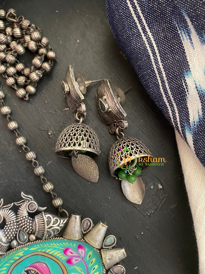 Silver Look Alike Pendant Afghani Chain Neckpiece-Green-princess hand painted into Green stone set pendant–neckpiece; silver rounded beads chain.