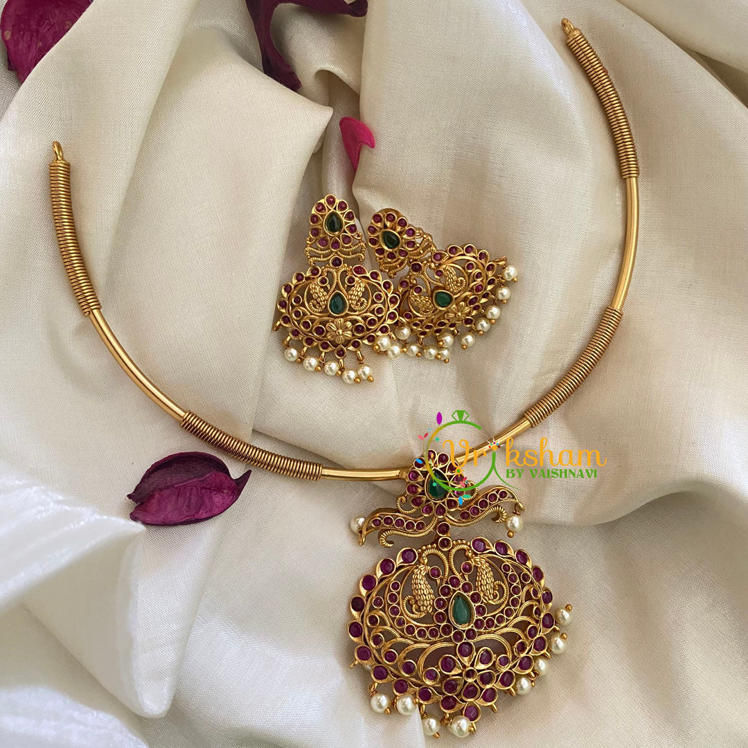 Premium AD Stone Pendant Hasli Choker- Dual Peacock premium quality AD Stone studded pendant hasli short neckpiece, comes with matching earrings.