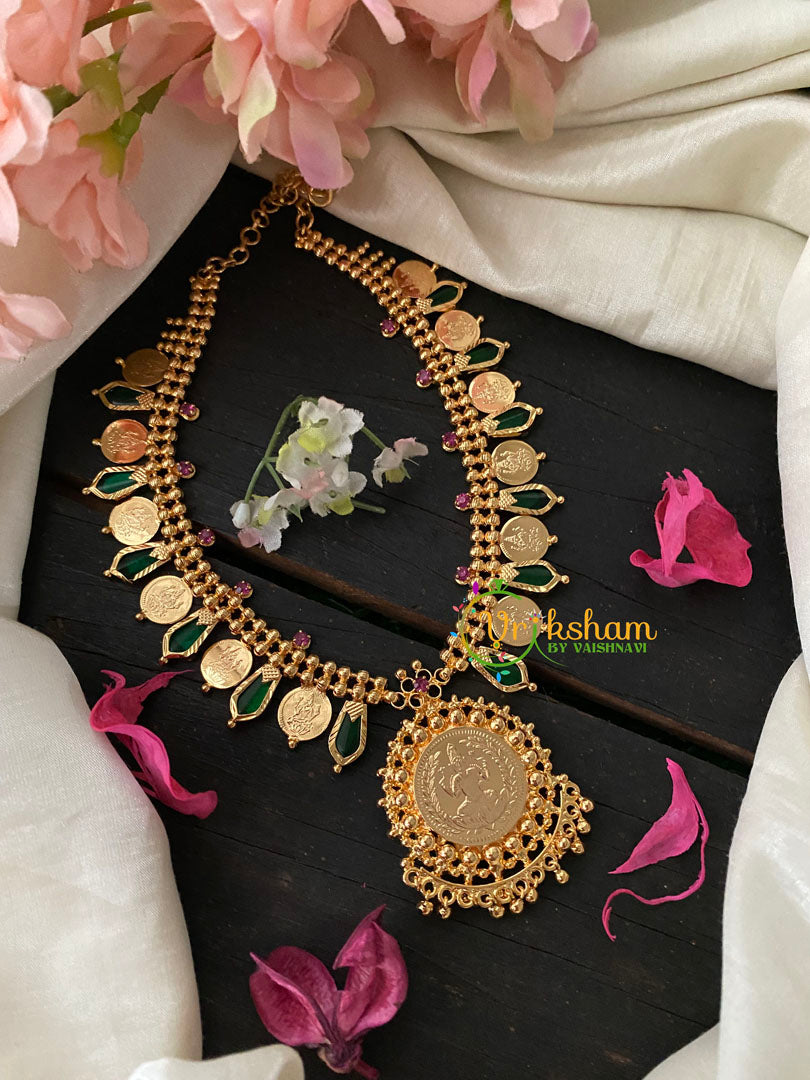 Traditional Lakshmi Pendant Palakka Coin Neckpiece -Traditional Kerala Temple jewelry- ad stone studded neckpiece with coin and stone arranged alternatively. NECKPIECE ONLY.