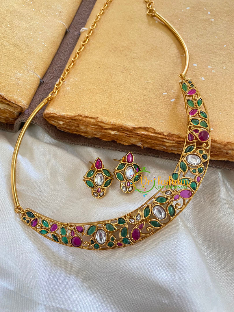Pendantless Hasli -Green Red-Oval - premium quality AD Stone studded NO PENDANT plain floral FILIGREE patterened hasli, comes with matching earrings.