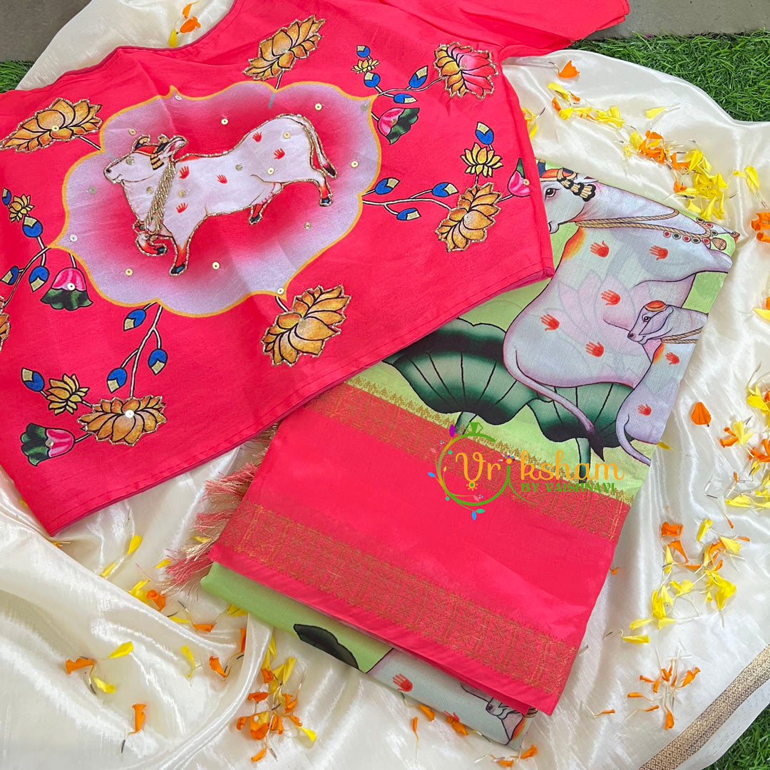 Pista Green with Pink Border Pichwai Kalamkari Saree – with traditional border – Pichwai digital print pattern throughout the saree; comes with PRE-STITCHED BLOUSE . Two side contrast traditional border and pallu.