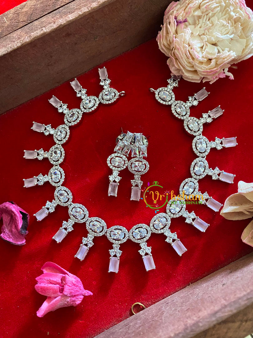 Pastel Pink American Diamond Neckpiece- Geometric Drop–WHITE TONE imitation jewelry set; Comes with a pair of similar danglers.