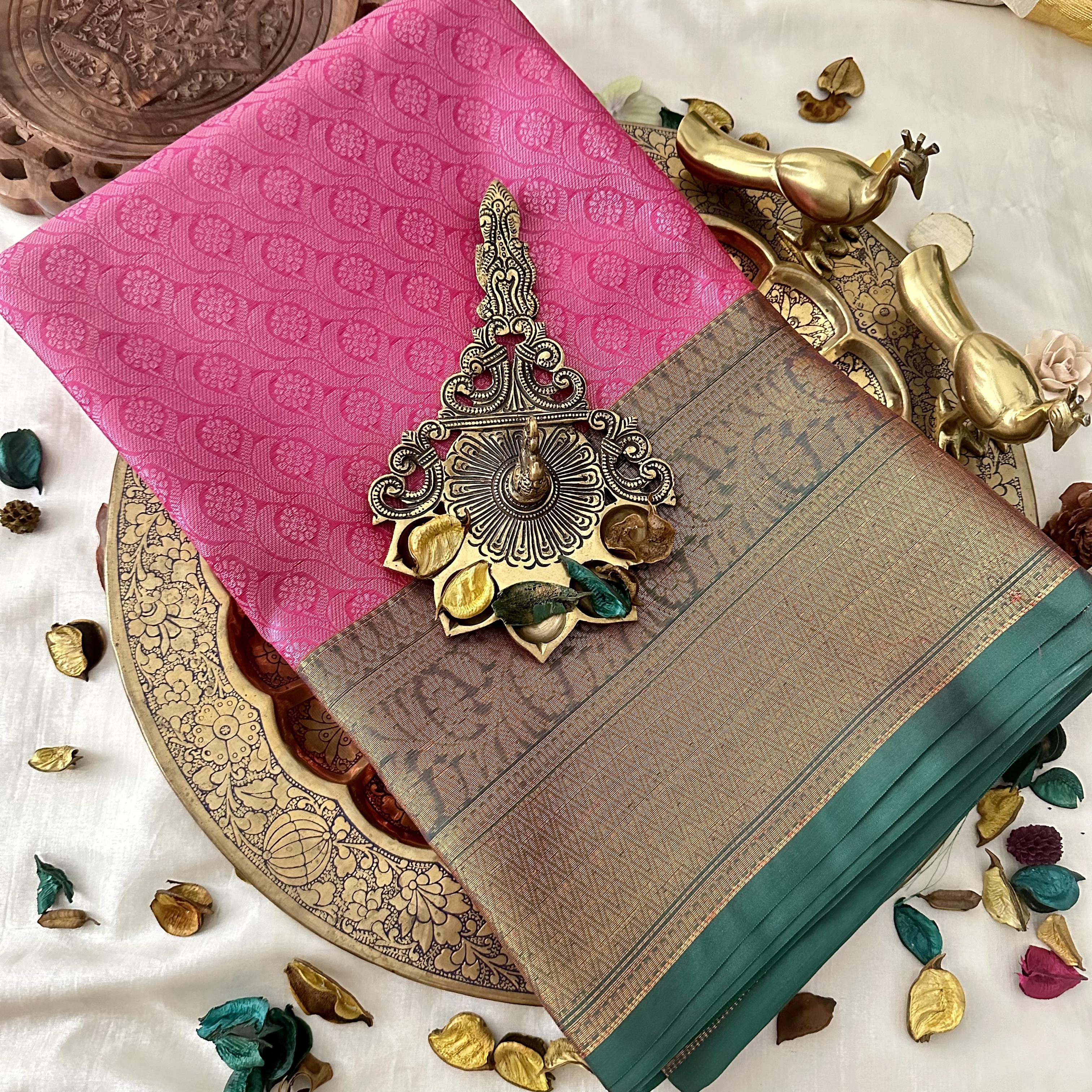 Pink Kora Muslin Saree with Dark Green Border – Festive wear Kora Muslin saree manufactured in Varanasi –designer printed throughout the saree ; comes with Blouse attached.