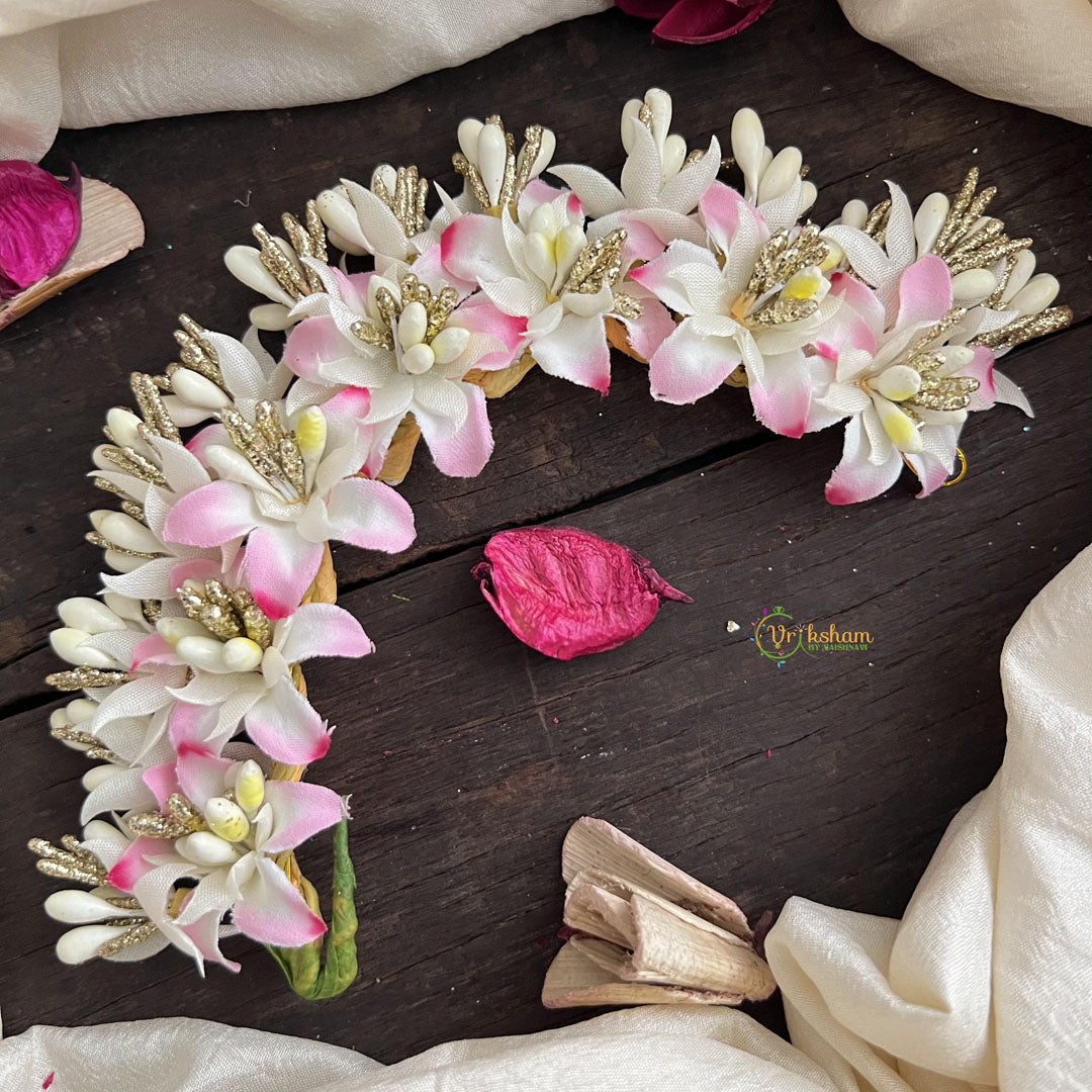Pink White with Beads - Tear drop beads - Flower Accessory- veni– Tie around 'U' shaped type veni hair accessory.