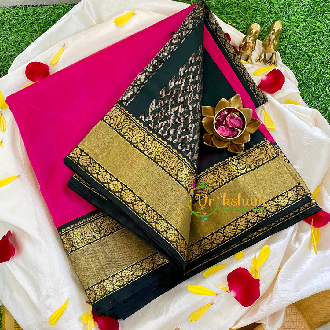 Pink with Black Silk Cotton Saree-Handloom Korvai - Festive wear saree –Plain Pattern throughout the saree; comes with Blouse attached. Two side contrast border and pallu.