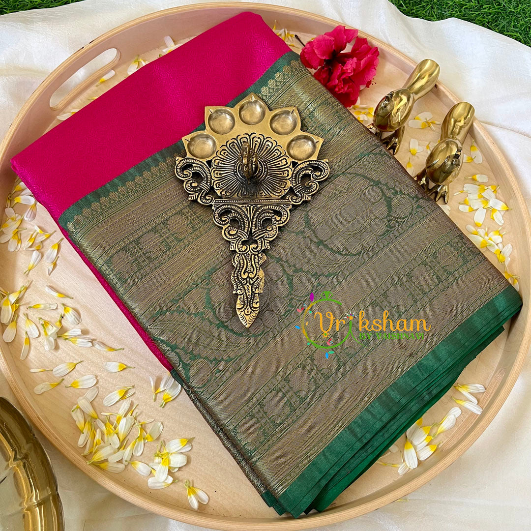 Pink with Green Border Kora Muslin Saree - Festive wear saree –plain throughout the saree; comes with Blouse attached. Two side border and pallu.