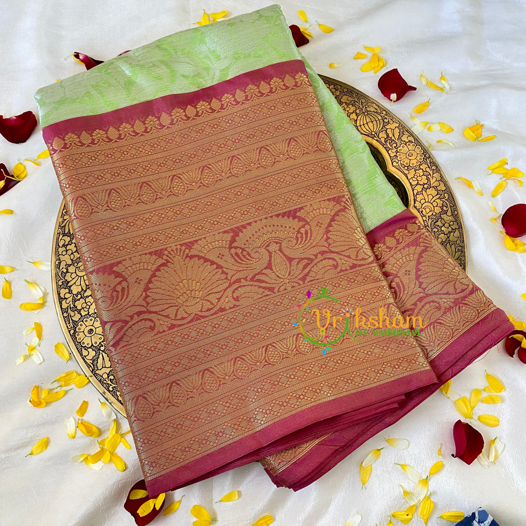 Pista Green Semi Benarasi Saree Festive wear saree –self work throughout the saree; comes with Blouse attached. Contrast two side border and pallu - one side bigger border.