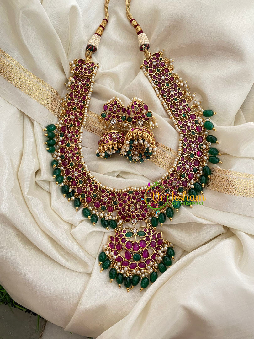 Exquisite Precious AD Stone Short Neckpiece-Green Bead- pearl lined red, green and white studded short neckpiece with matching earrings. Premium quality, gives unique royal look.