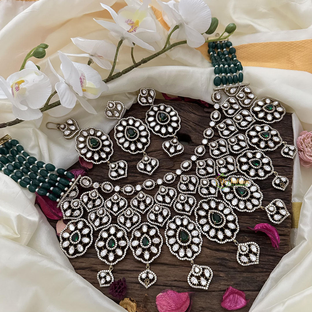 Indulge in pure elegance with our Precious Bridal Victorian Diamond Neckpiece. Adorned with rich green beads and lustrous pearls, this necklace exudes luxury and sophistication. A perfect addition to any formal outfit, it will elevate your look and make you feel like a true fashion icon.