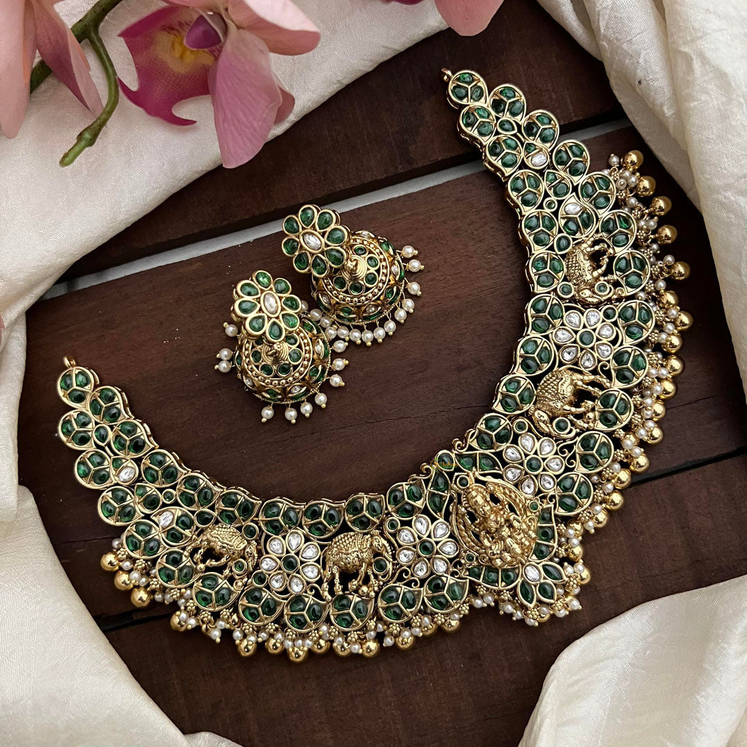 Bring prosperity and elegance to any outfit with our Precious Green Stone Lakshmi Elephant Neckpiece. Adorned with golden beads and pearls, this luxurious piece features a stunning white stone Lakshmi elephant design that embodies beauty and good fortune. Perfect for any occasion, this neckpiece will make you feel like a true queen. Comes with matching earrings.