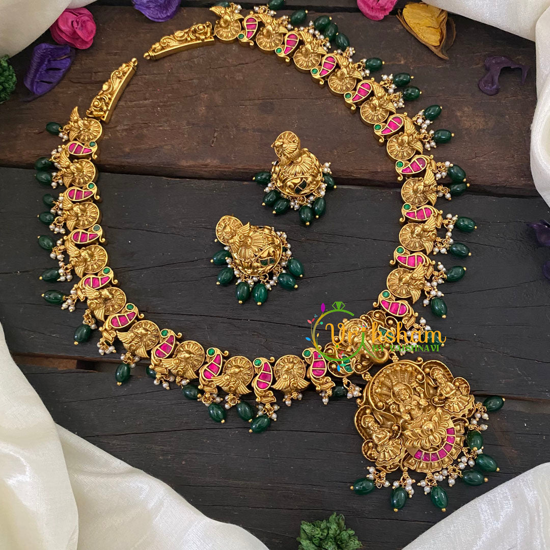 Precious Jadau Kundan Lakshmi Haram - Premium Gold polish intricately worked with kundan & precious stone studded, pendant, premium quality neckpiece.Green Bead Finish.