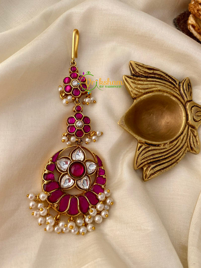 Precious Jadau Kundan Maang Tikka-PINK WHITE– single strand kundan and kemp set with pearls -one of our highest quality royal jewellery; handmade by artisans; this boasts the design and quality of a real silver but not a silver at an afforable price.