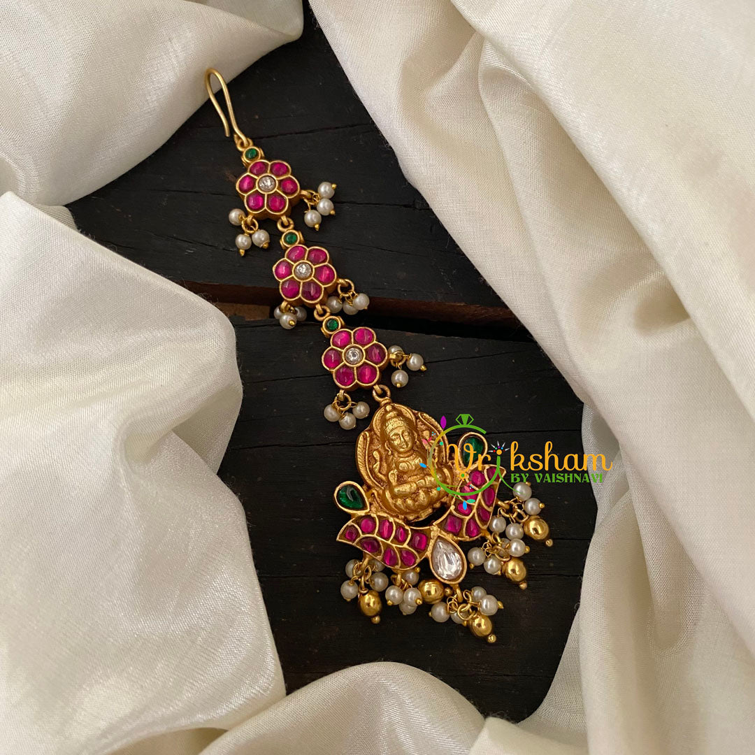 Precious Jadau Kundan Lakshmi Maang Tikka-Pink Green - single strand kundan and kemp set with artificial beads and pearls -one of our highest quality royal jewellery; handmade by artisans; this boasts the design and quality of a real silver haram but at an afforable price.