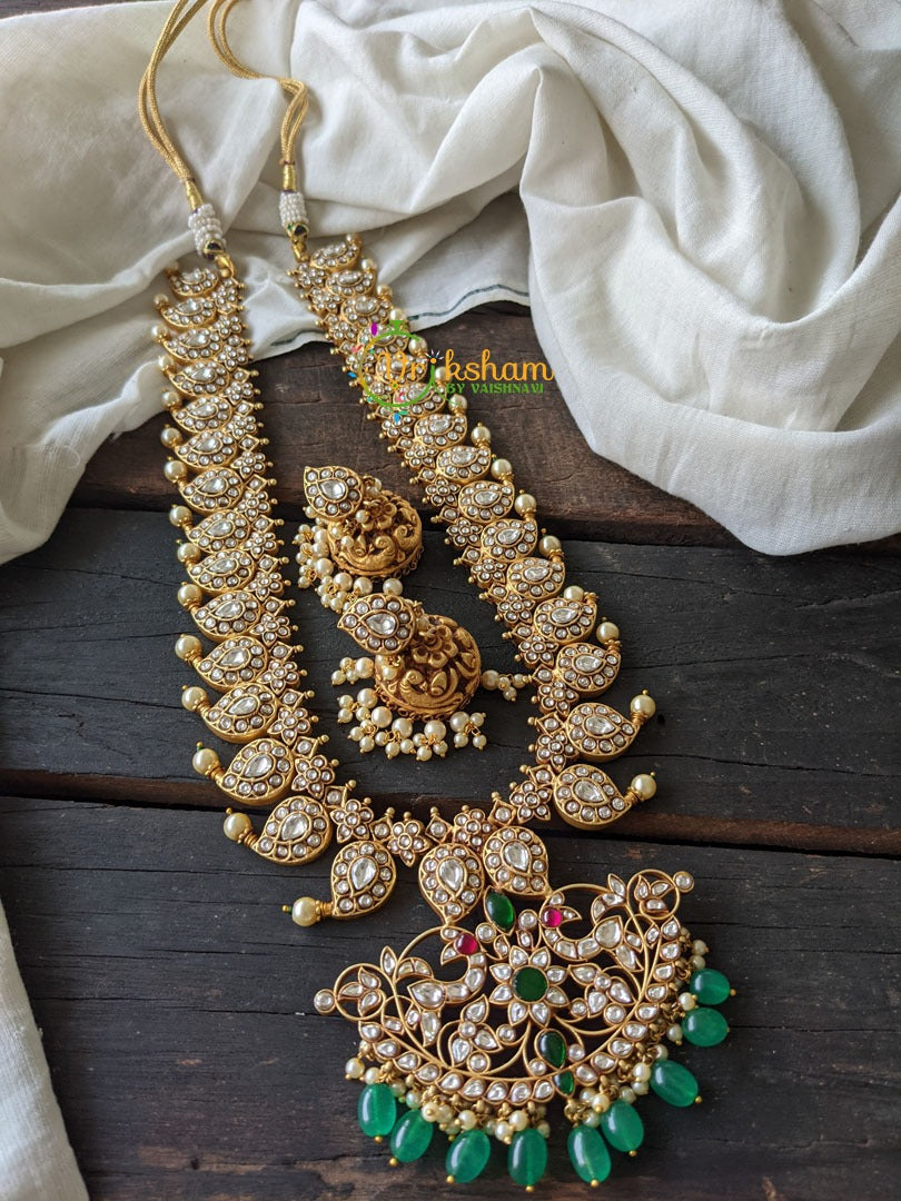 Precious Jadau Kundan and Kemp Maanga Haram-White stone set is one of our highest quality royal jewellery; handmade by artisans; this boasts the design and quality of a real silver with antique geru polish.
