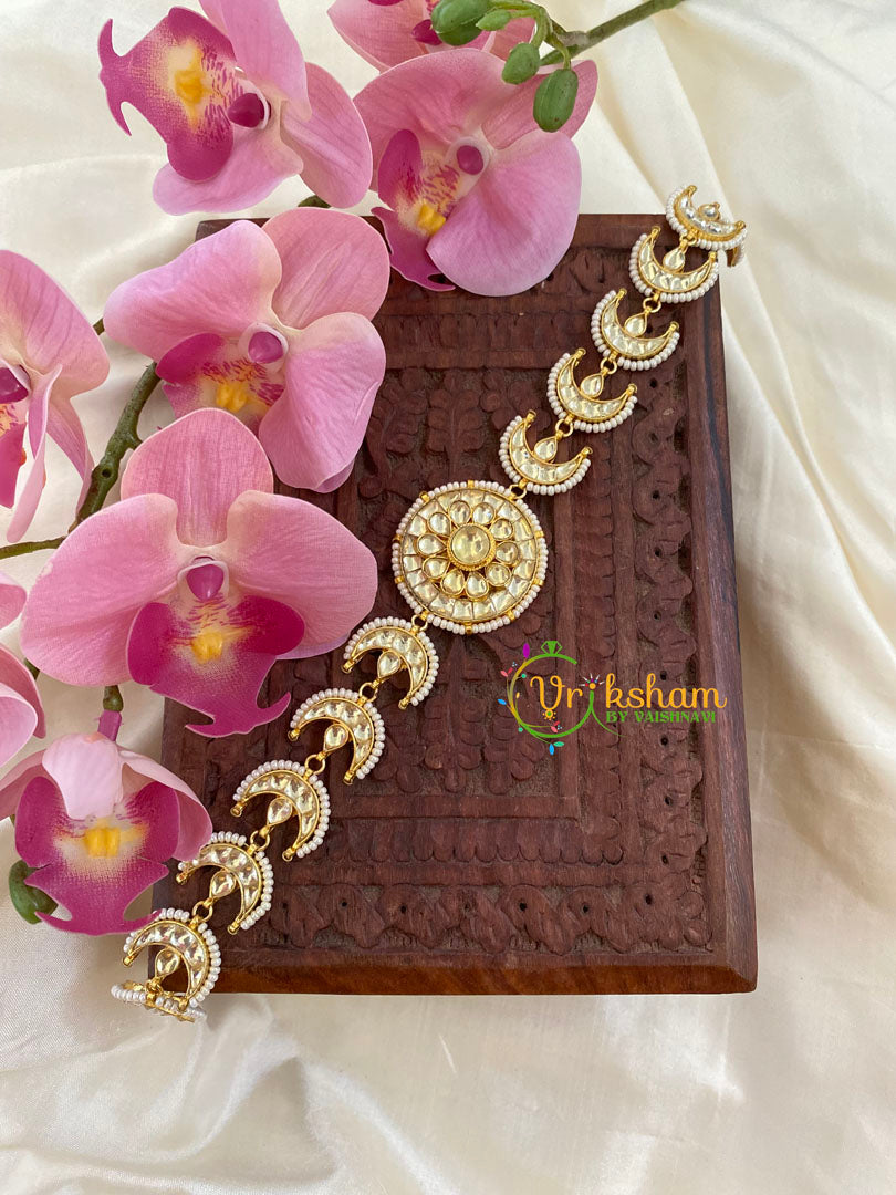 Precious Jadau Kundan Sheeshphool-Floral Chandh- white kundan, centre round pattern halfmoon throughout matha patti bridal hair accessory.
