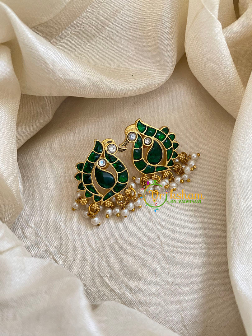 Precious Jadau Kundan Studs -Green-Peacock-Pearls-J1479