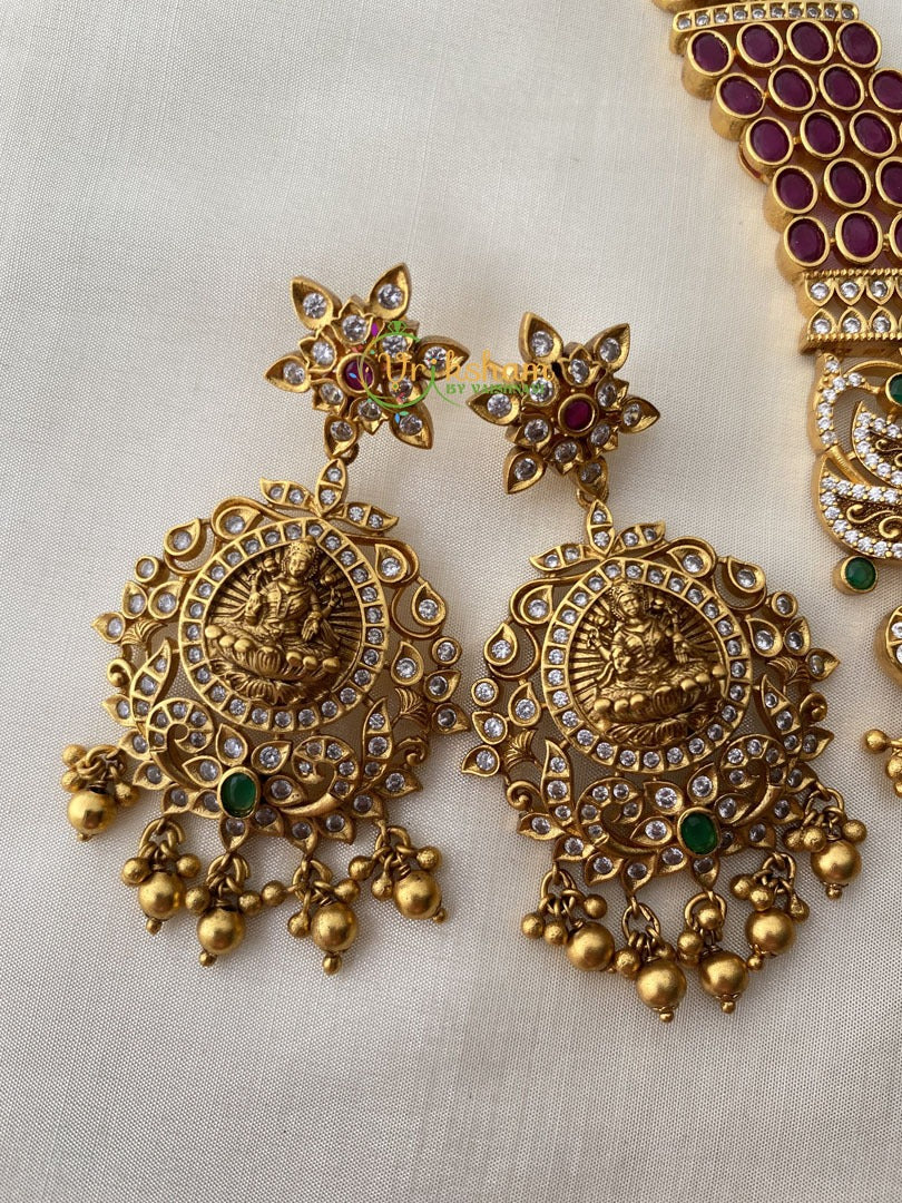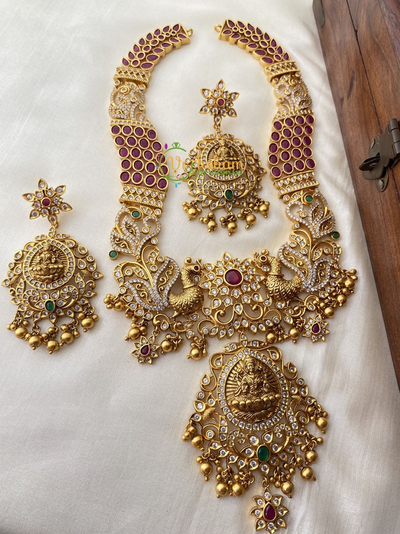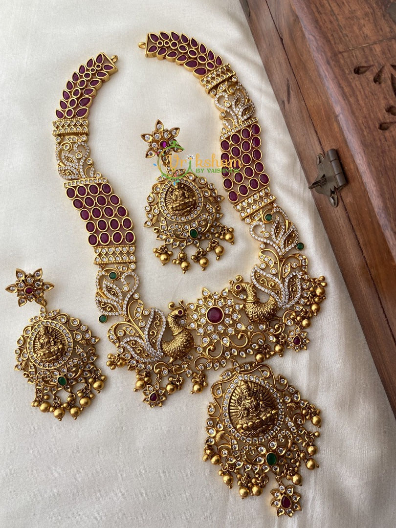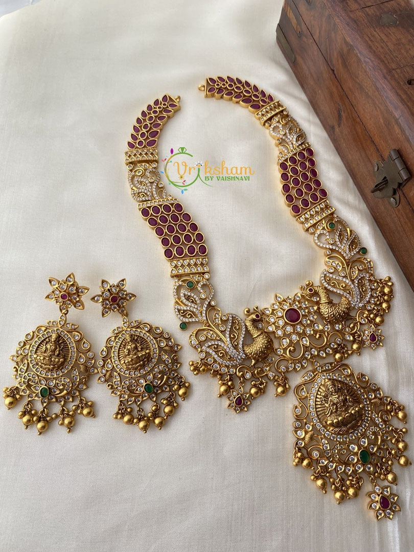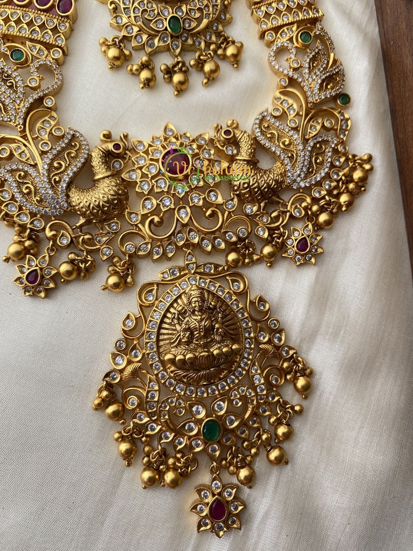 Precious Kemp and AD Stone Temple Haram. Premium Antique Finish Gold look alike kemp and ad stone lakshmi centre temple haram -peacock and floral pattern. Comes with matching danglers.