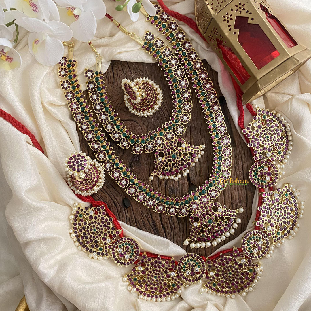 Introducing the Precious Kemp Bridal Set, a luxurious and exclusive collection featuring a short and long neckpiece, matching jhumkas, and a kamarbandh. Adorn yourself with these intricate and exquisite pieces, perfect for any special occasion. Elevate your style with this stunning bridal set.