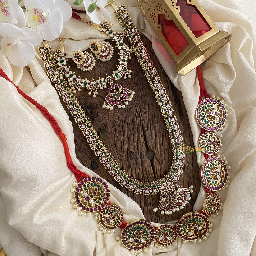 Introducing the Precious Kemp Bridal Set, a luxurious and exclusive collection featuring a short and long neckpiece, matching jhumkas, and a kamarbandh. Adorn yourself with these intricate and exquisite pieces, perfect for any special occasion. Elevate your style with this stunning bridal set.