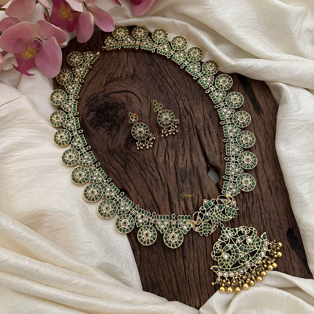 Indulge in pure luxury with our Elegant Precious Kemp Dual Peacock Long Neckpiece. Adorned with stunning golden beads and a vibrant green accent, this piece is a true work of art. The twin peacock design adds a touch of elegance and sophistication, making it a must-have for any fashion-forward individual. Elevate your style with this exclusive and exquisite neckpiece. Comes with matching earrings.