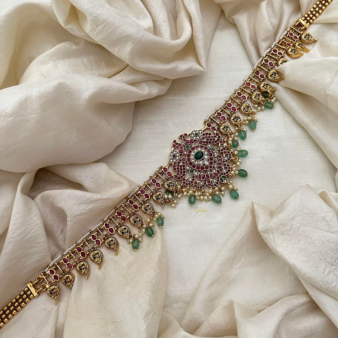 Add a touch of elegance to your bridal look with our Precious Kemp Dual Peacock Pendant Hip Chain. Featuring a stunning sea green bead and intricate peacock pendants, this piece will surely make a statement. Perfect for showcasing your unique sense of style on your special day.