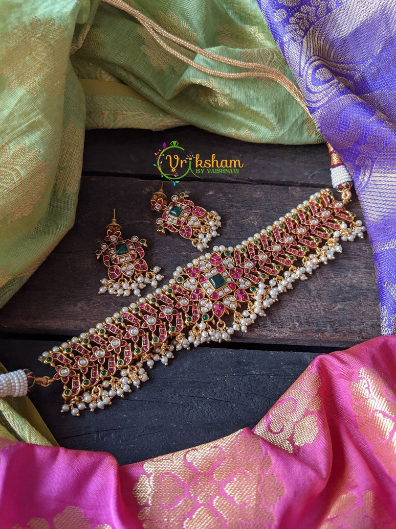 Precious Kemp High Neck Choker -Red kemp and white AD stone and centre green studded premium quality high neck choker; only pearl finish, Comes with matching ear hangings.