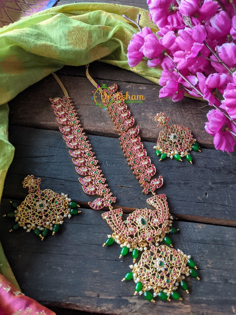 Precious Kemp Maanga Long Haram -Premium quality neckpiece with precious kemp studded peacock and pendants; pearls and green bead finish, comes with matching ear hangings.