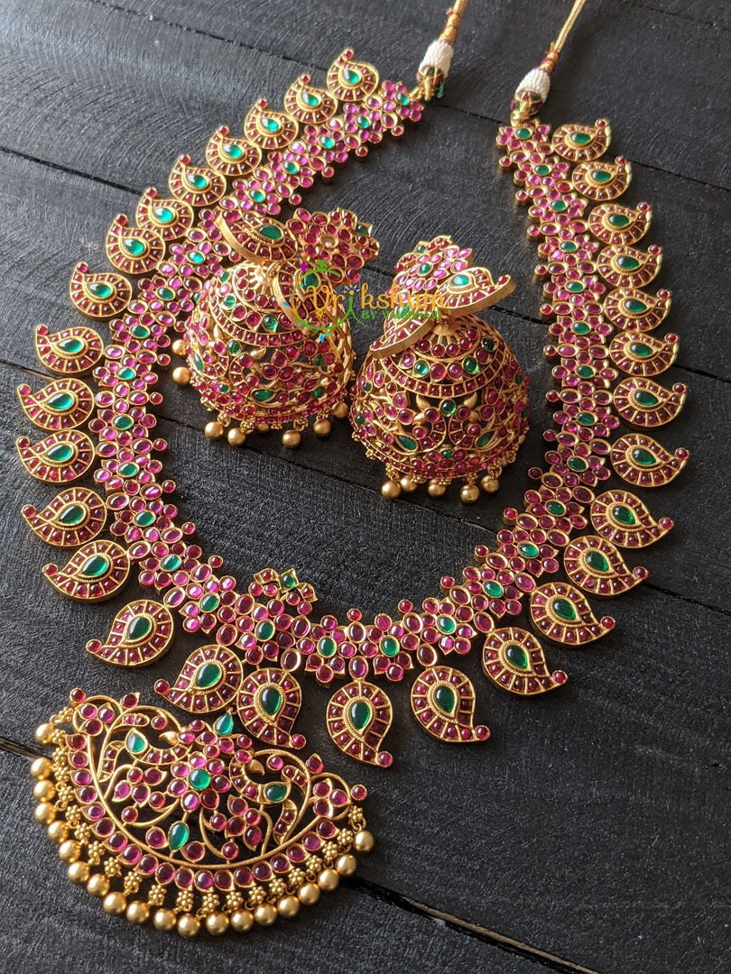 Precious Kemp Maanga Haaram -Mid length neckpiece -Red Green kemp neckpiece ( no pearl )with matching jumbo(XL) jhumkas .