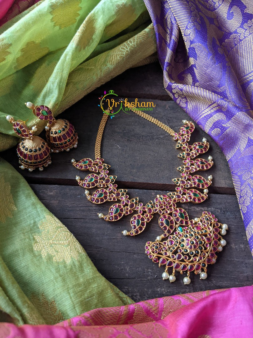 Traditional Precious Kemp Maanga Neckpiece -Red, Green - Predominantly a red pink kemp maanga neckpiece with green kemp centre stones along the length and pendant, studded with pearl ends. Comes with matching jhumkas.