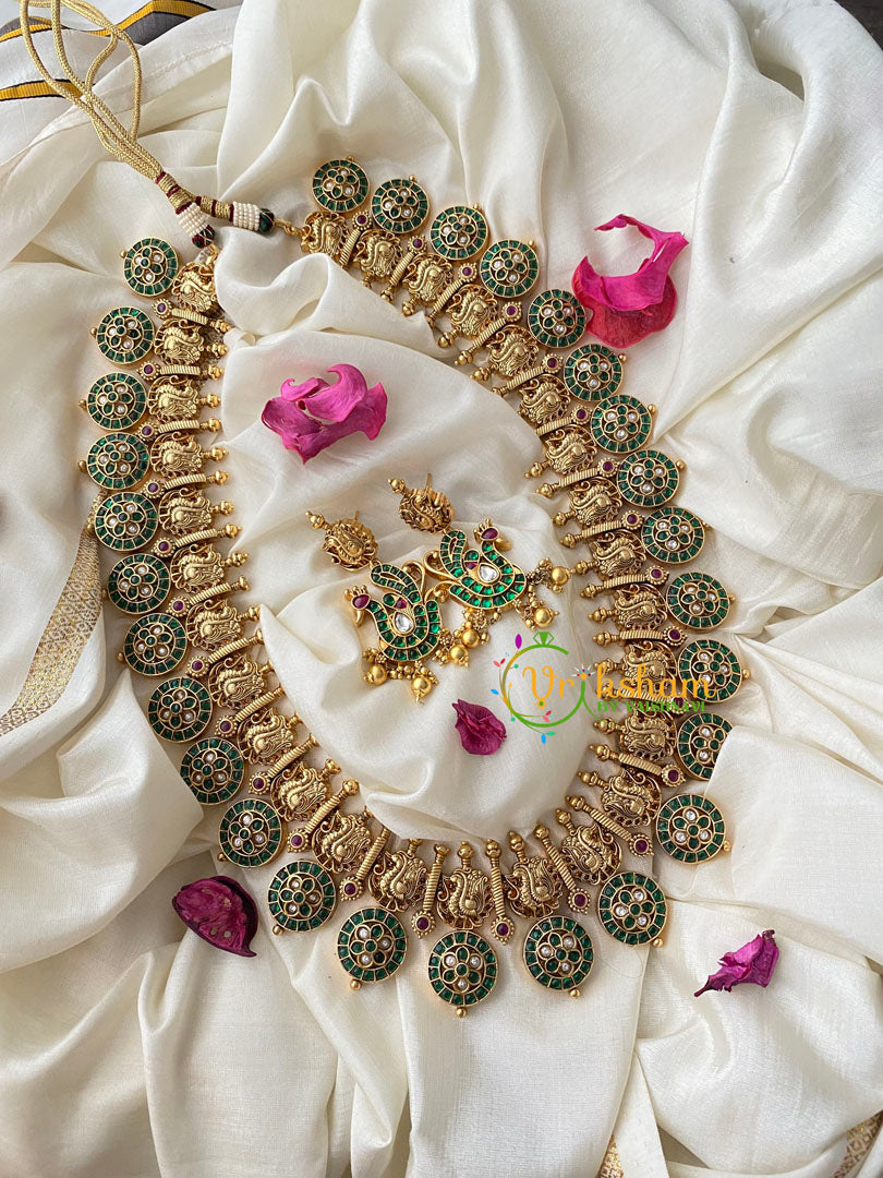 Premium American diamond Coin Haram -Green and white Ad stone Coin style long neckpiece; geometric and flower pattern with Annam ; comes with matching ear hangings.