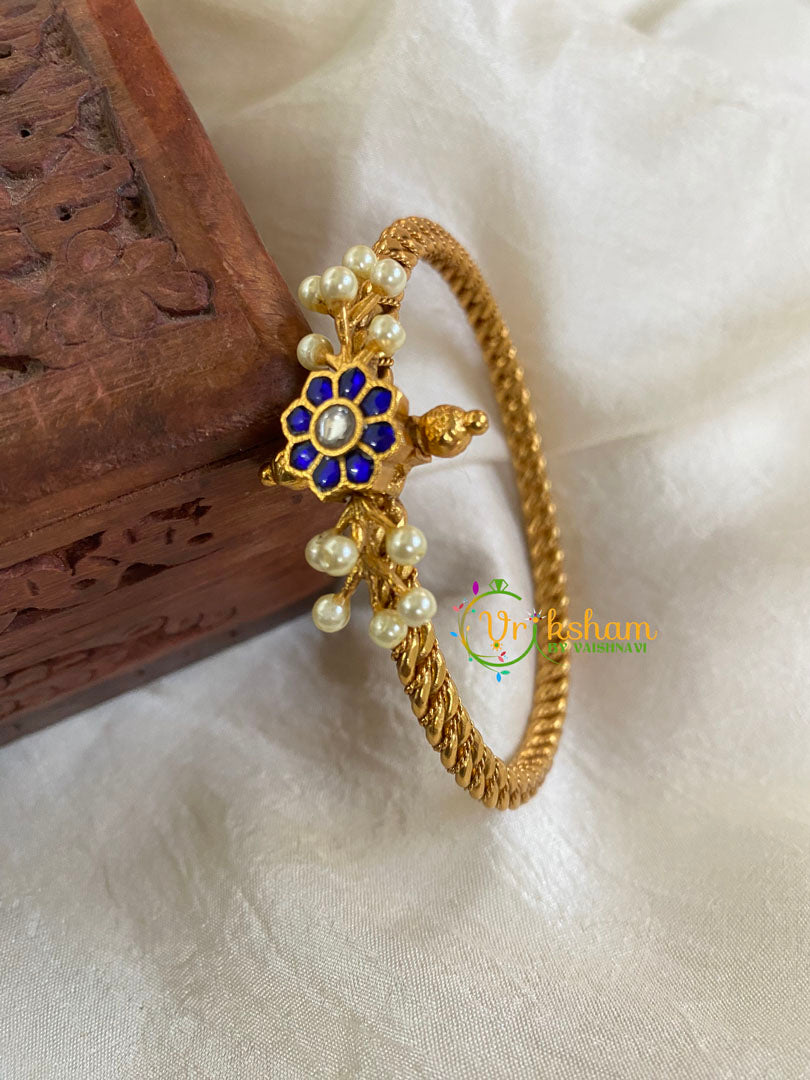 Precious Kundan Jadau Kada Bangle-Floral Pearl design -Blue and centre white stone studded screw type openable kada bangle. Comes as single piece only.