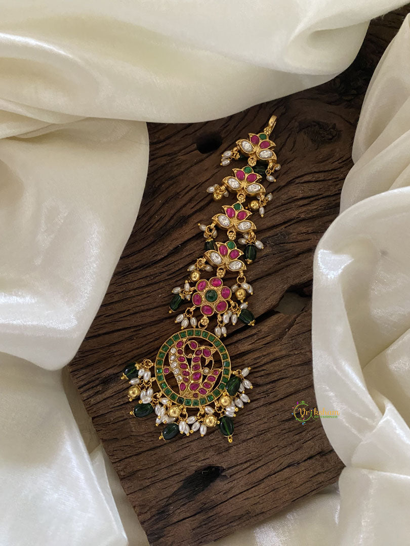 Precious Kundan Jadau Peacock Maang Tikka -Green Bead and Pearls - a symbol of cultural beauty and sophistication. This remarkable piece showcases intricate design and delicate floral motifs embellished with shining crystals, beads, or pearls. Elevate your look with its subtle charm and romantic allure, making it the perfect addition to any ensemble.